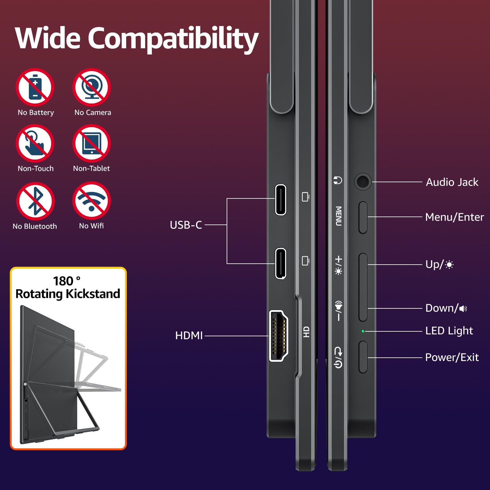 - VESA Mountable and Integrated Stand: The portable laptop monitor has two mounting options to meet your needs: Standard 75x75mm VESA holes provide multiple options to mount the portable second display on any wall or tabletop. The monitor also has a built-in stand that offers great flexibility and versatility for different scenarios